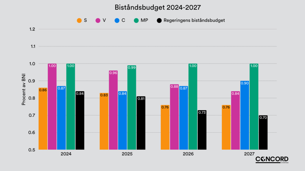 Likt förra året når varken S eller C upp till åtagandet om en procent av BNI i sina budgetar. De ger dock löften om att återgå till nivån. Oroande nog når inte heller V hela vägen fram utan landar på 0,96 procent, och med ytterligare sänkning kommande år. MP är det enda partiet som håller åtagandet.